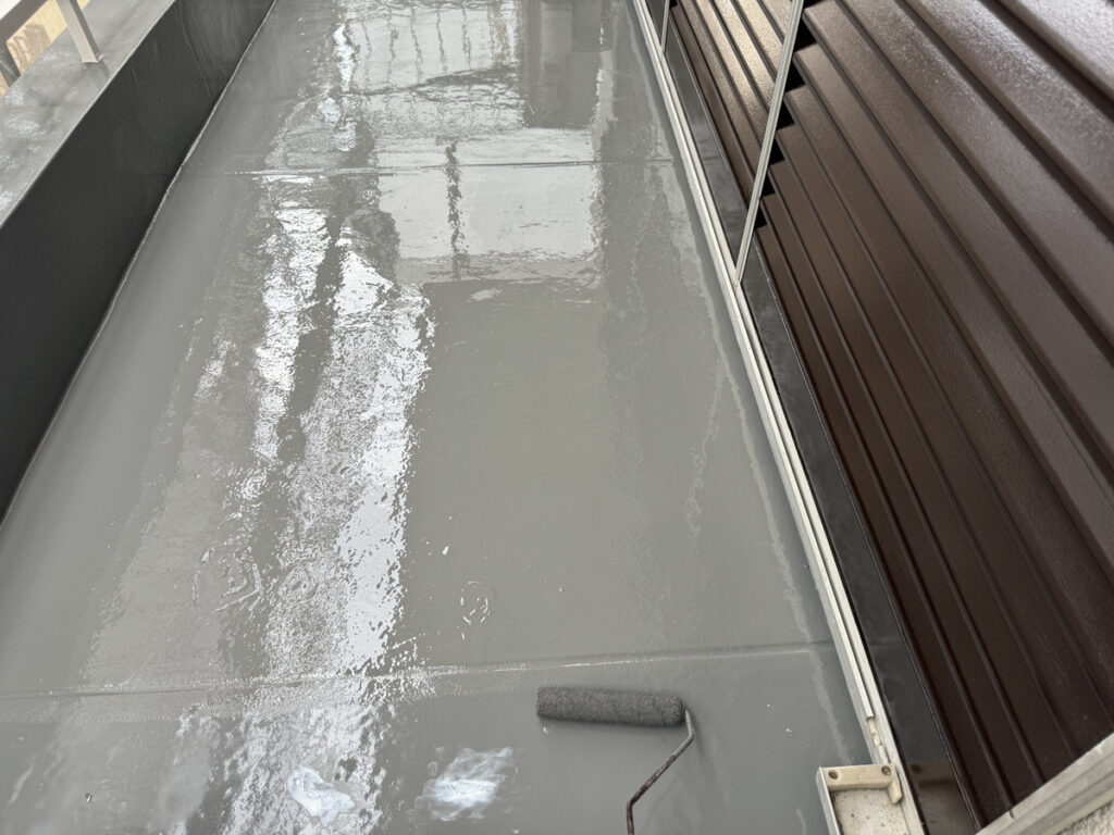 トップコートの塗布です。紫外線から防水層を保護するため、仕上げ材(トップコート)を塗ります。